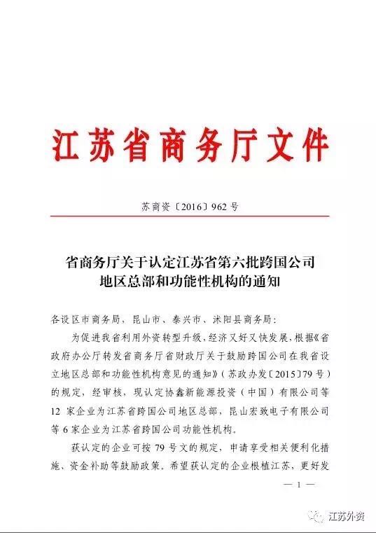 省商务厅关于认定江苏省第六批跨国公司地区总部和功能性机构的通知